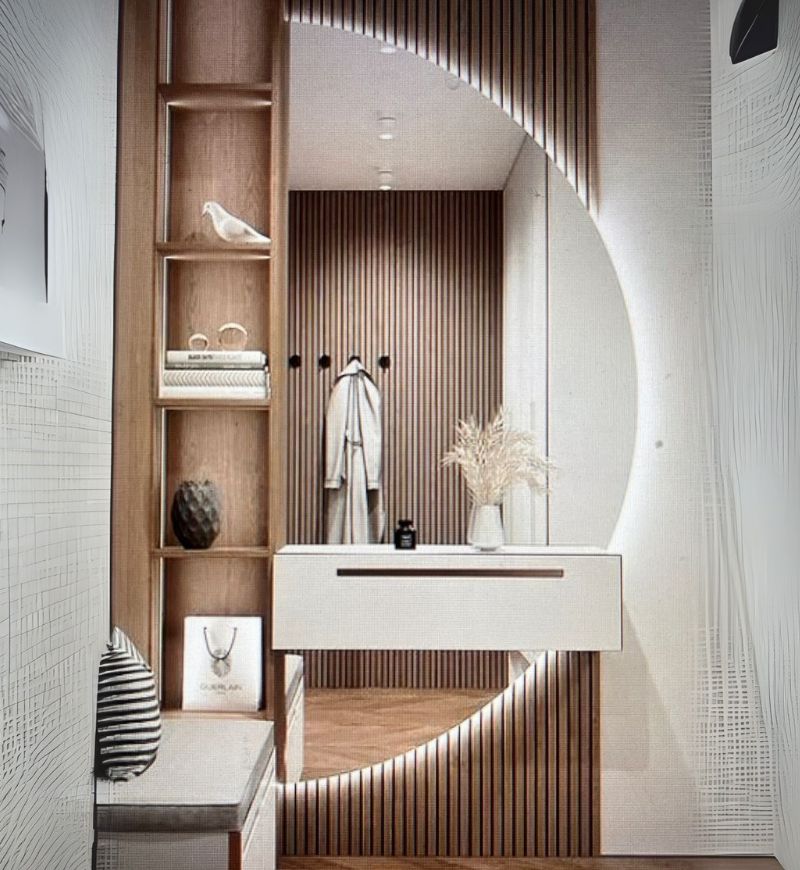 El Espejo LUNA, con su forma semi-redonda, aporta una sensación de calidez y elegancia a cualquier espacio.